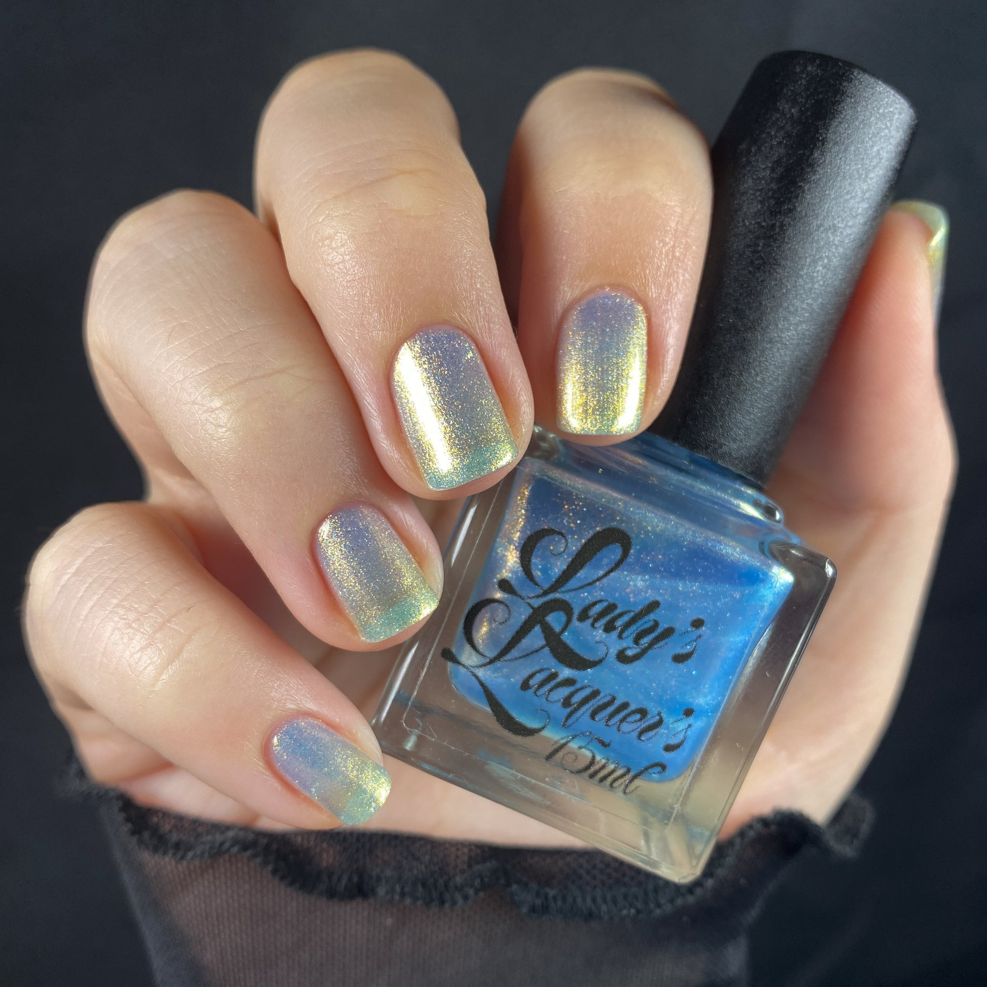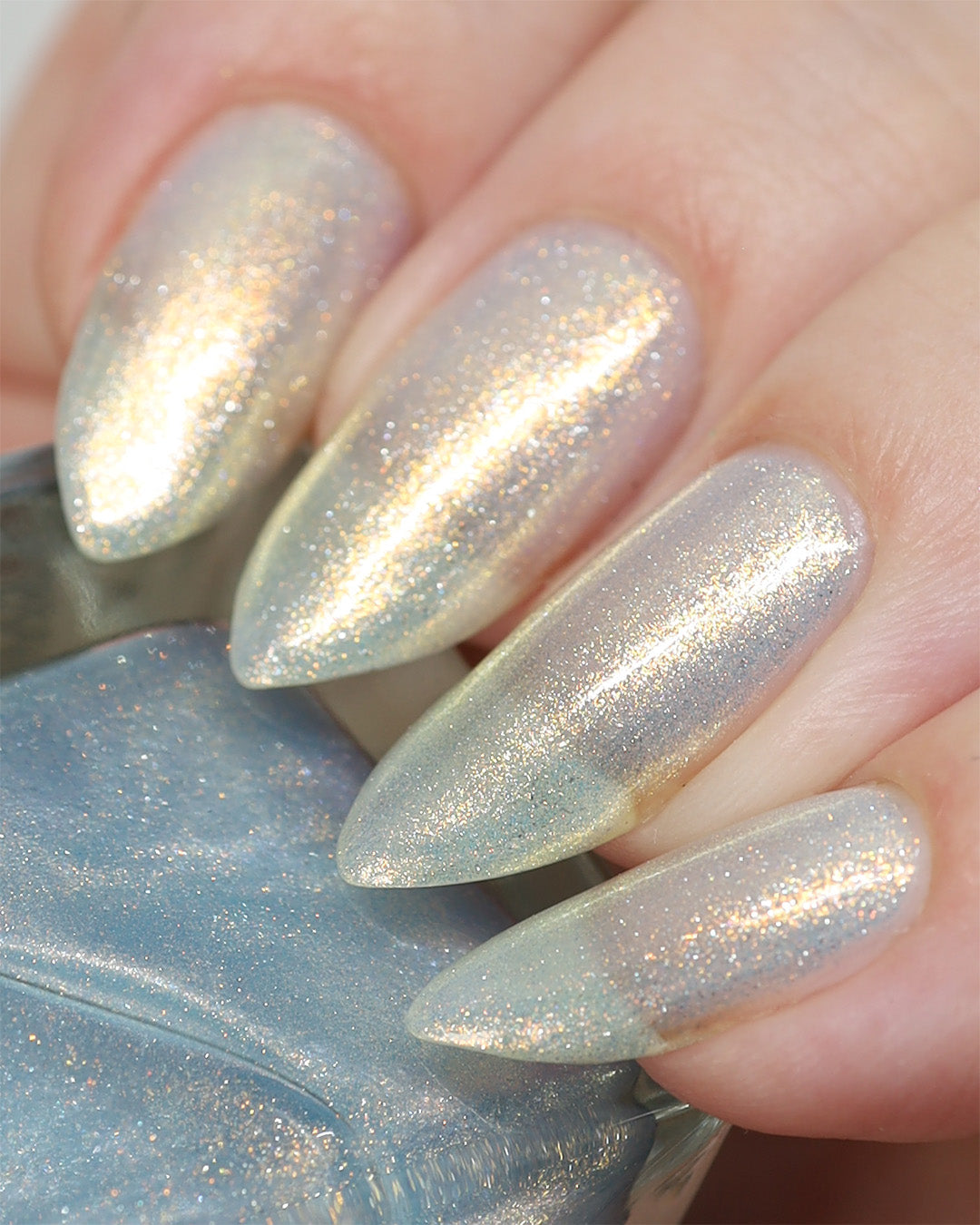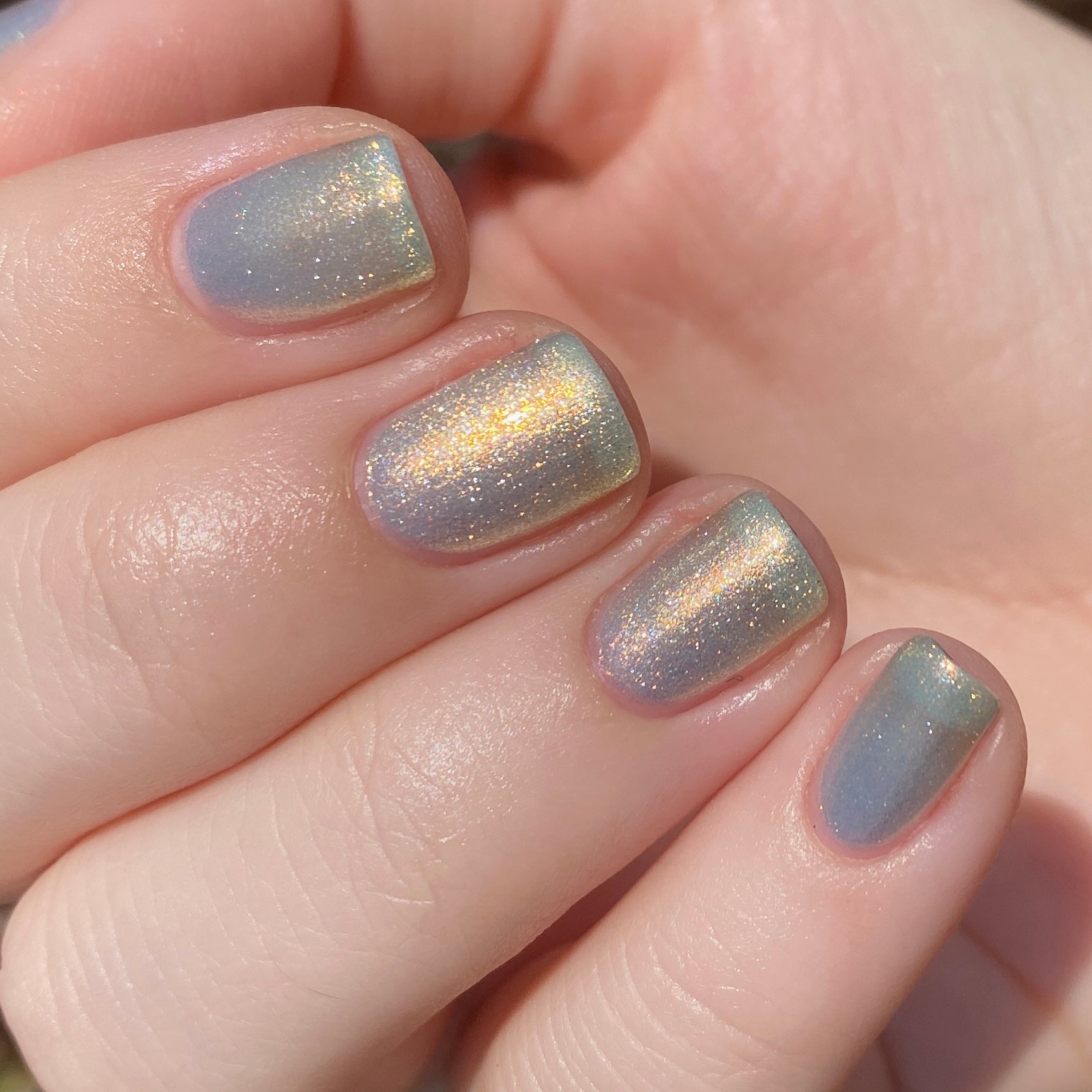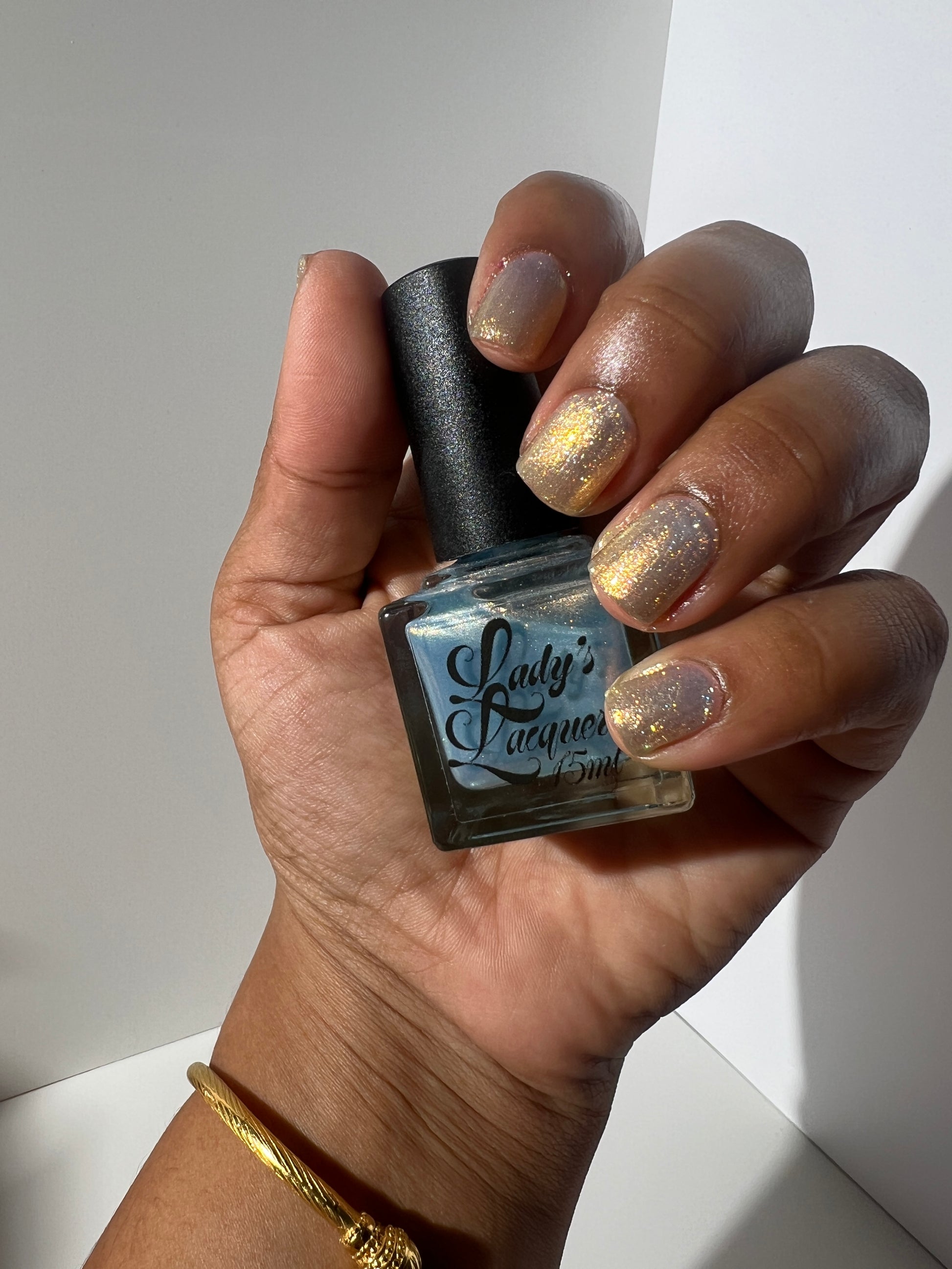 Sometimes we feel a little blue, but there's always a sparkle of sunshine that will shine through! A Pale Blue Sheer Polish with an intense gold/silver glitter and a Gold Flare.