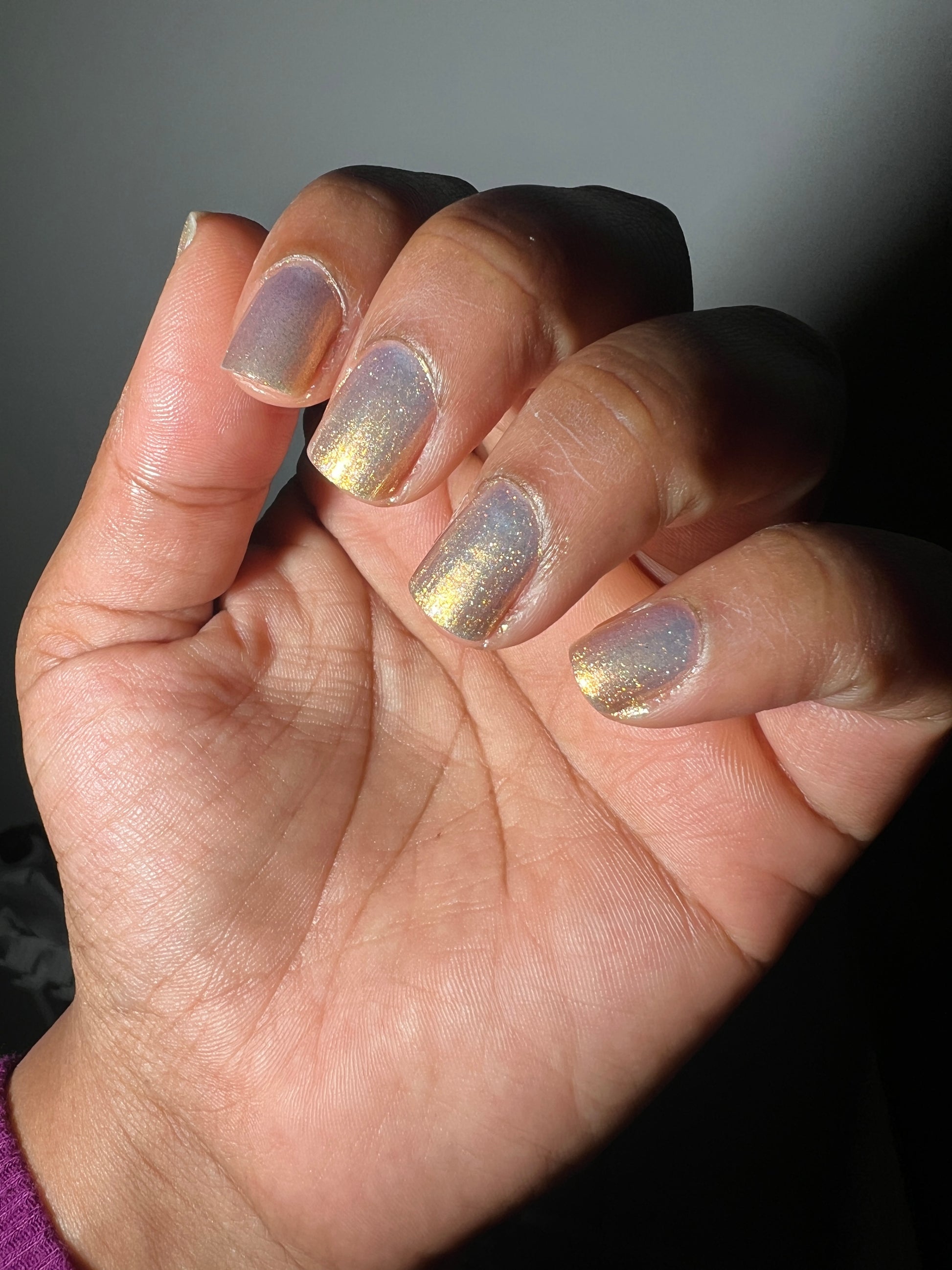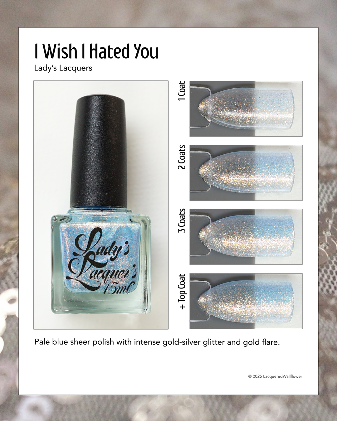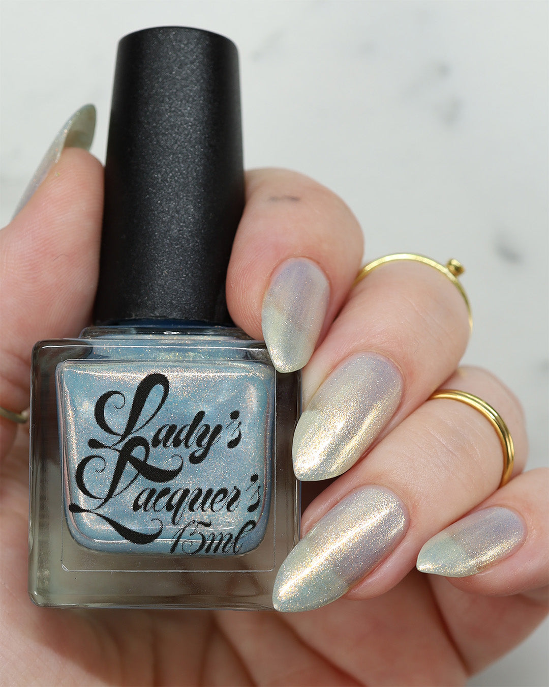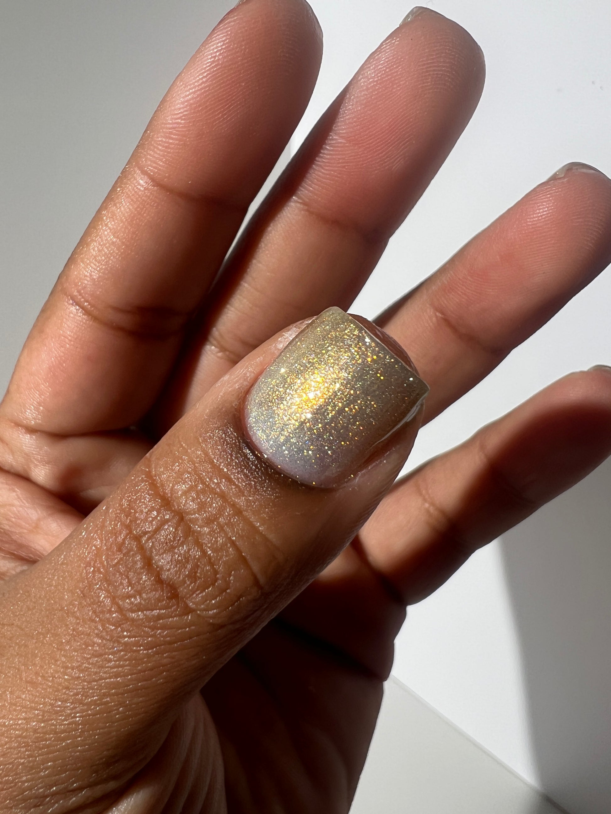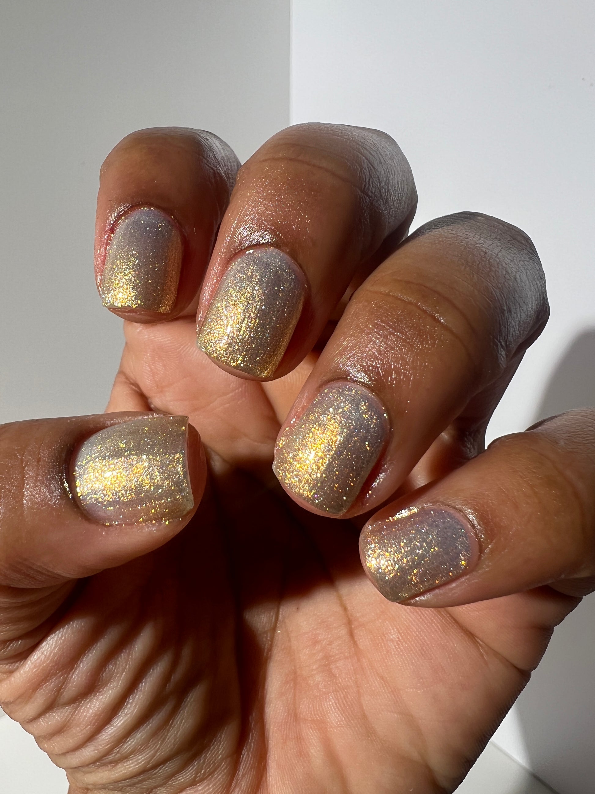 Sometimes we feel a little blue, but there's always a sparkle of sunshine that will shine through! A Pale Blue Sheer Polish with an intense gold/silver glitter and a Gold Flare.