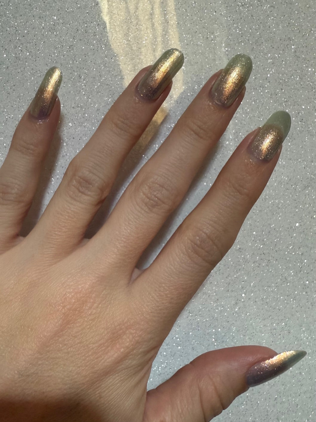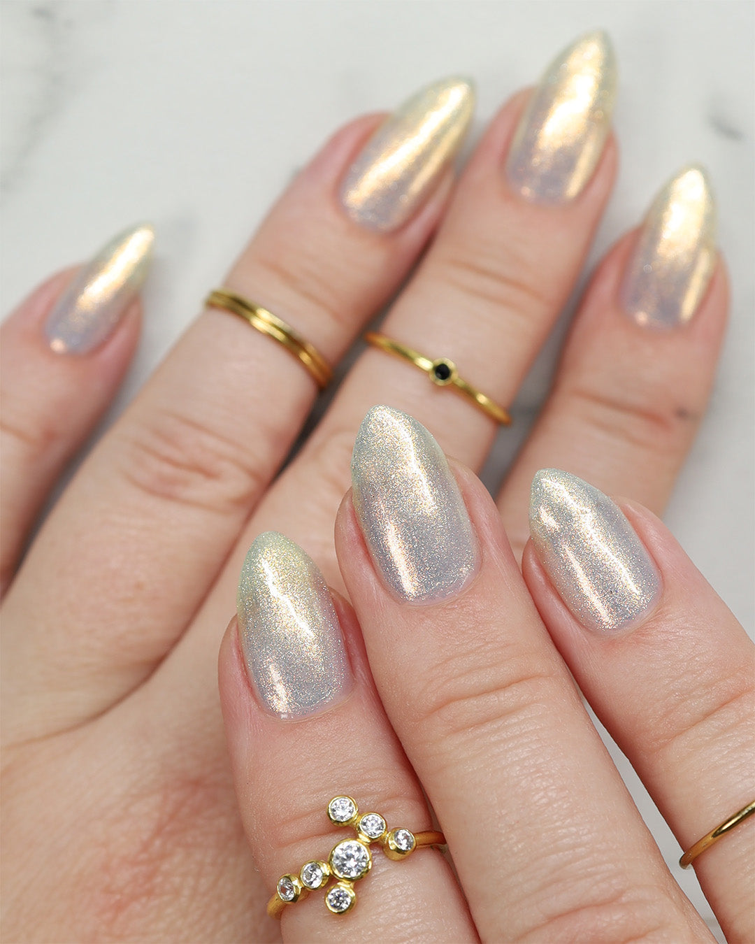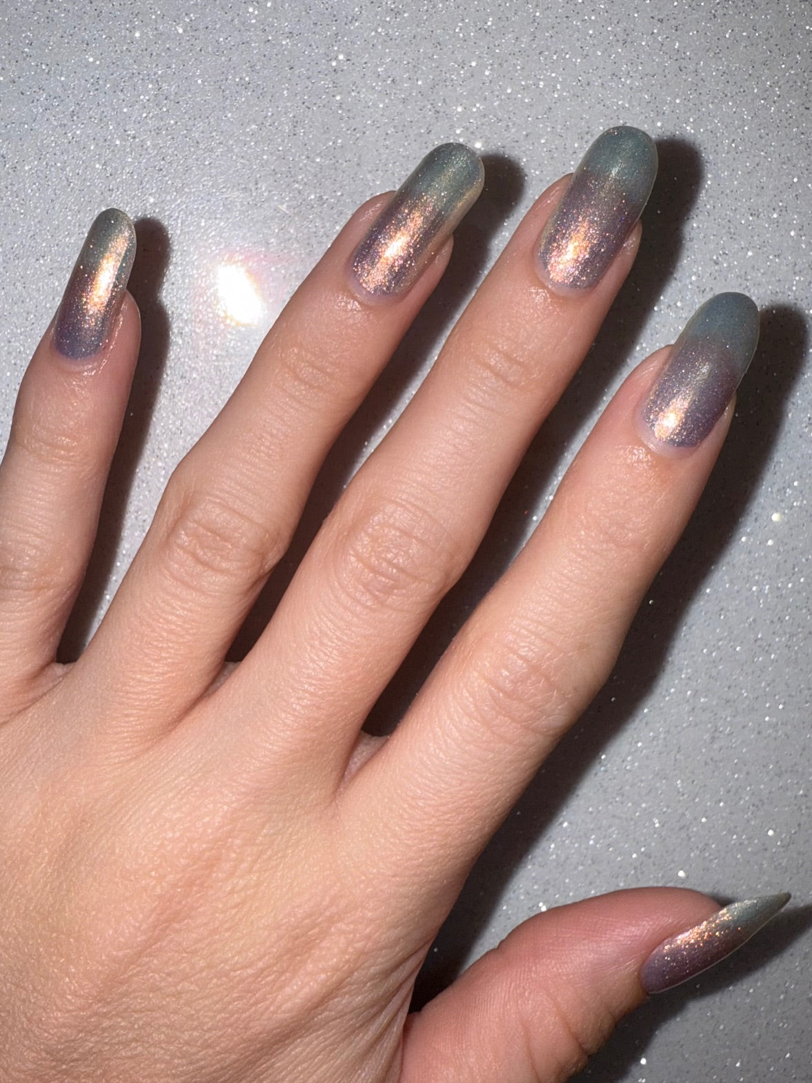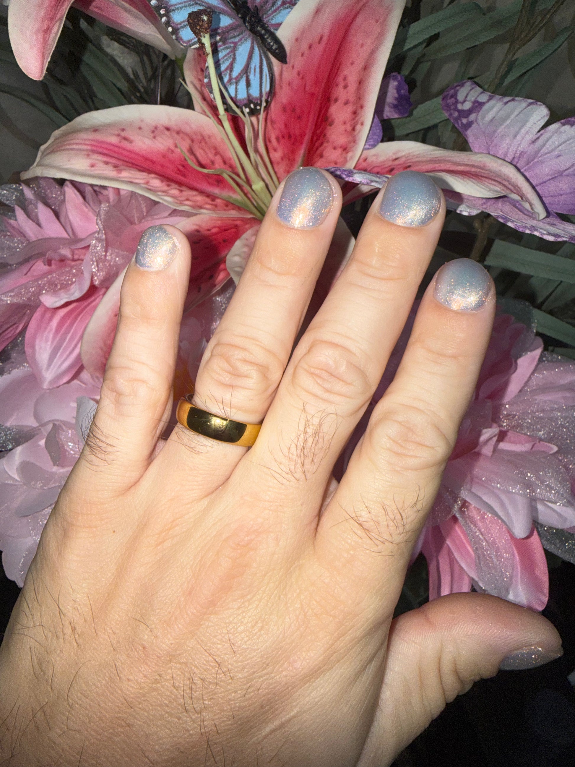 Sometimes we feel a little blue, but there's always a sparkle of sunshine that will shine through! A Pale Blue Sheer Polish with an intense gold/silver glitter and a Gold Flare.