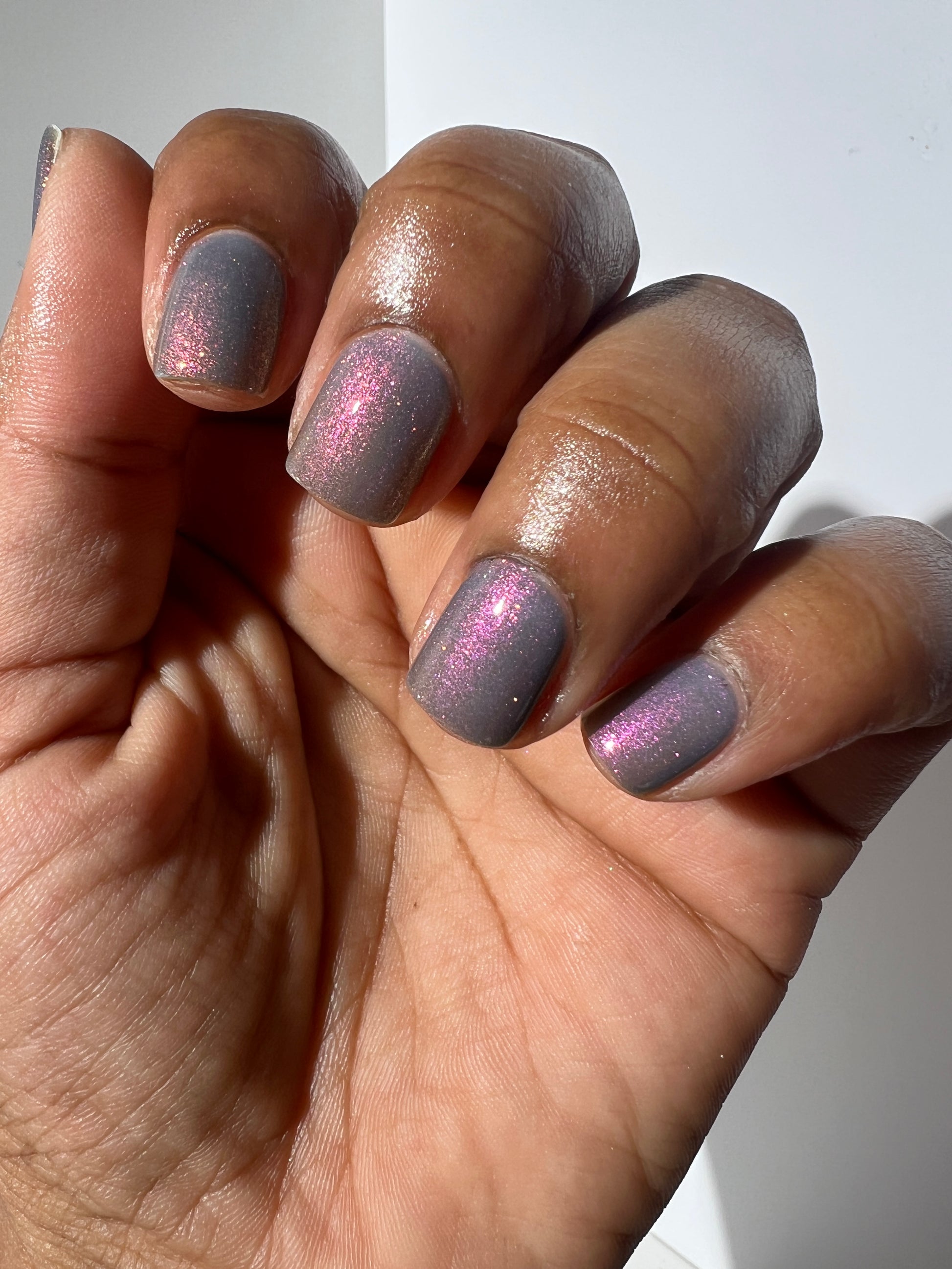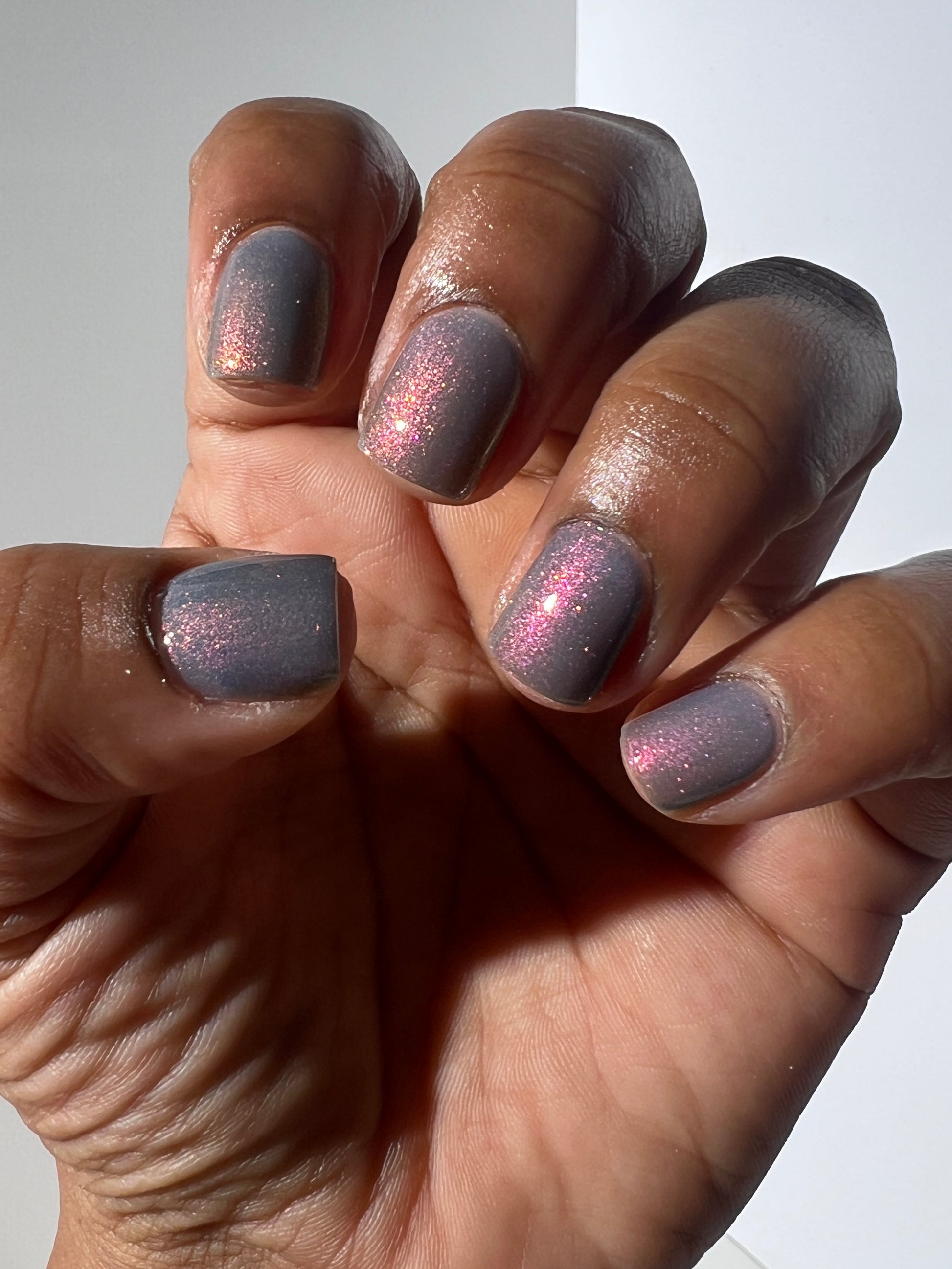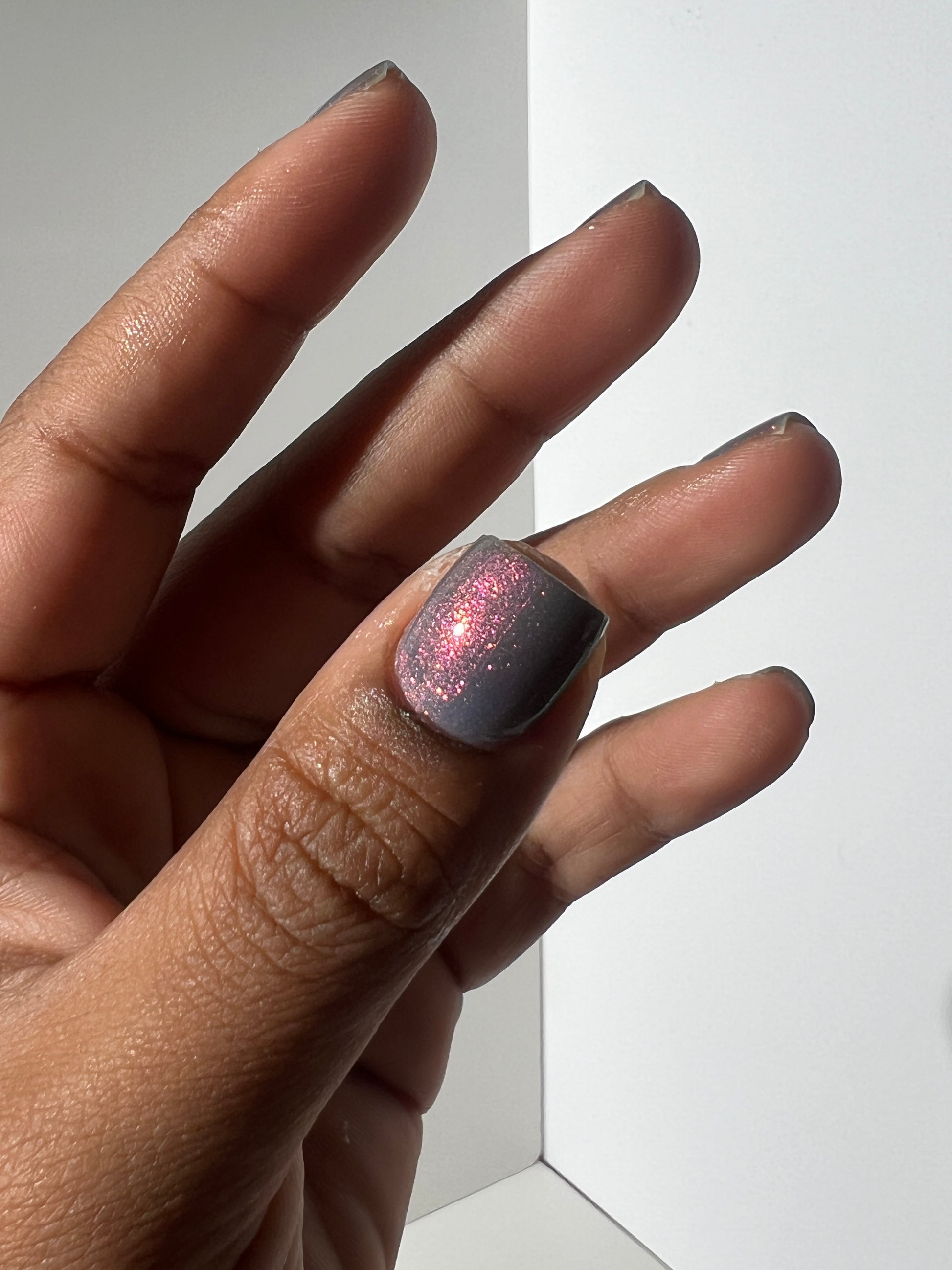Witness your nails transform and glow with this lovely Navy/Periwinkle/Dusty Magenta Tri Thermal polish, with a Fuchsia/Gold/Orange/Green Shift, that Glows in the Dark Aqua!